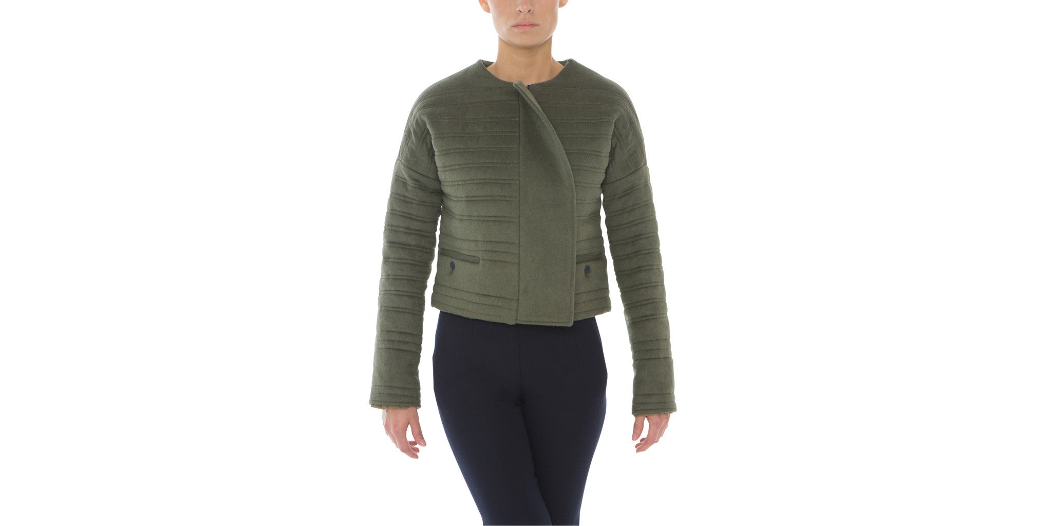 Exclusive woven cashmere coat styled with a cropped boxy cut, collarless round neck and subtle rib stitch detail. A versatile piece that is ideal for colder fall days.