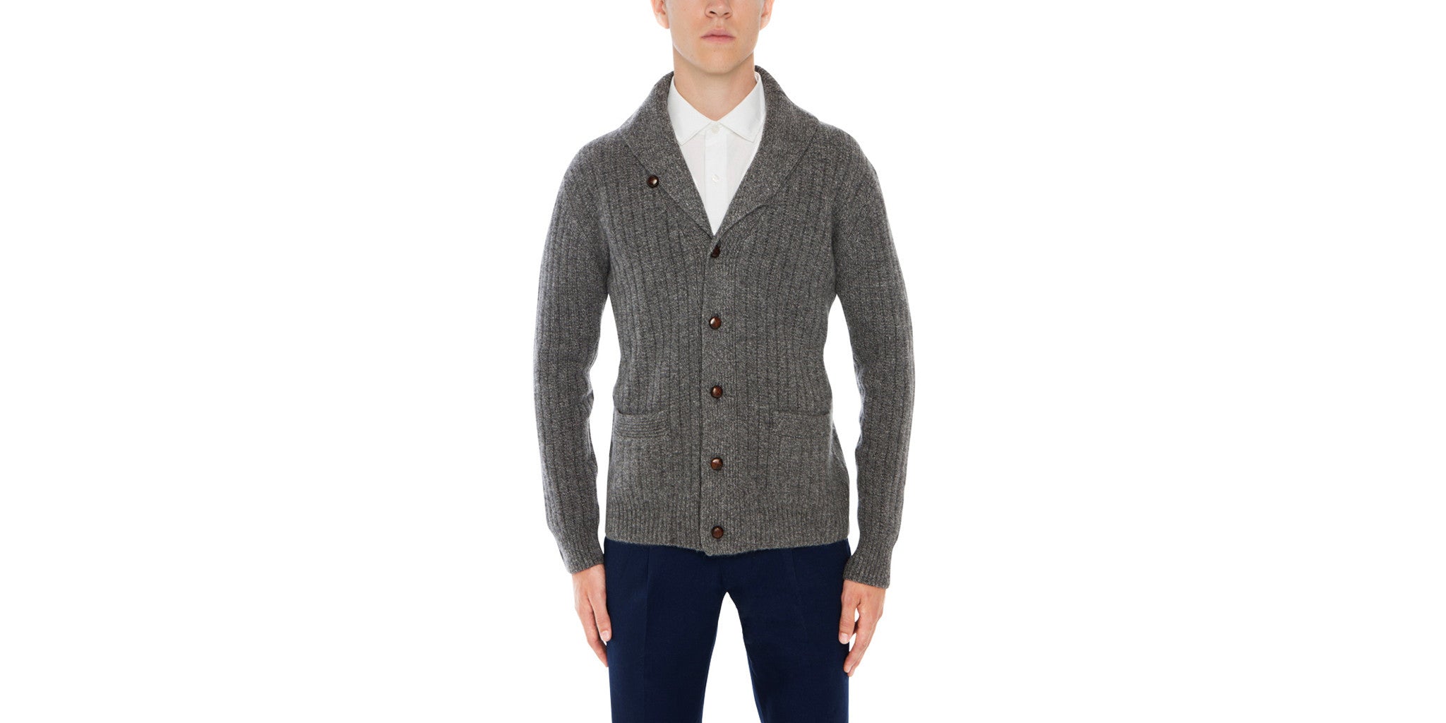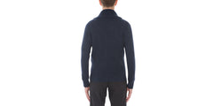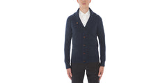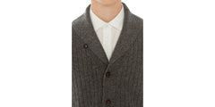 Refined four thread pure cashmere chunky cardigan with shawl collar worked in rib stitch. Hip length, heavy weight bomber styled with a tailored fit. Perfect worn as light outerwear at the start of the season, or a valuable item to wear in winter overlays. The ultimate fibres come together to to create an exclusive knit with an effortlessly casual flavor.