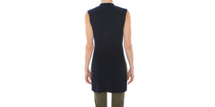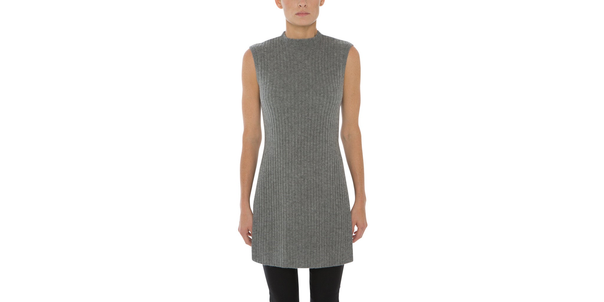An approach to the classic tunic, worked in a single-tread rib-knit to bring out the silky properties of the Noble cashmere fiber. Soft and enveloping, this piece is particularly flattering due to its sleeveless fitted silouette and below hip lenght with side slits which make it an essential and convenient element for layering.